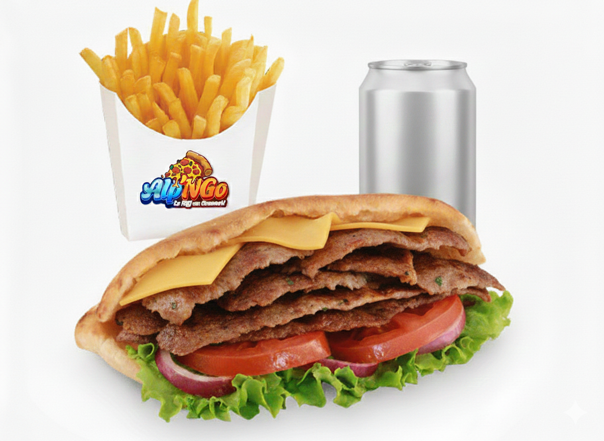 Pain maison, viande de kebab avec des crudités au choix et une sauce au choix